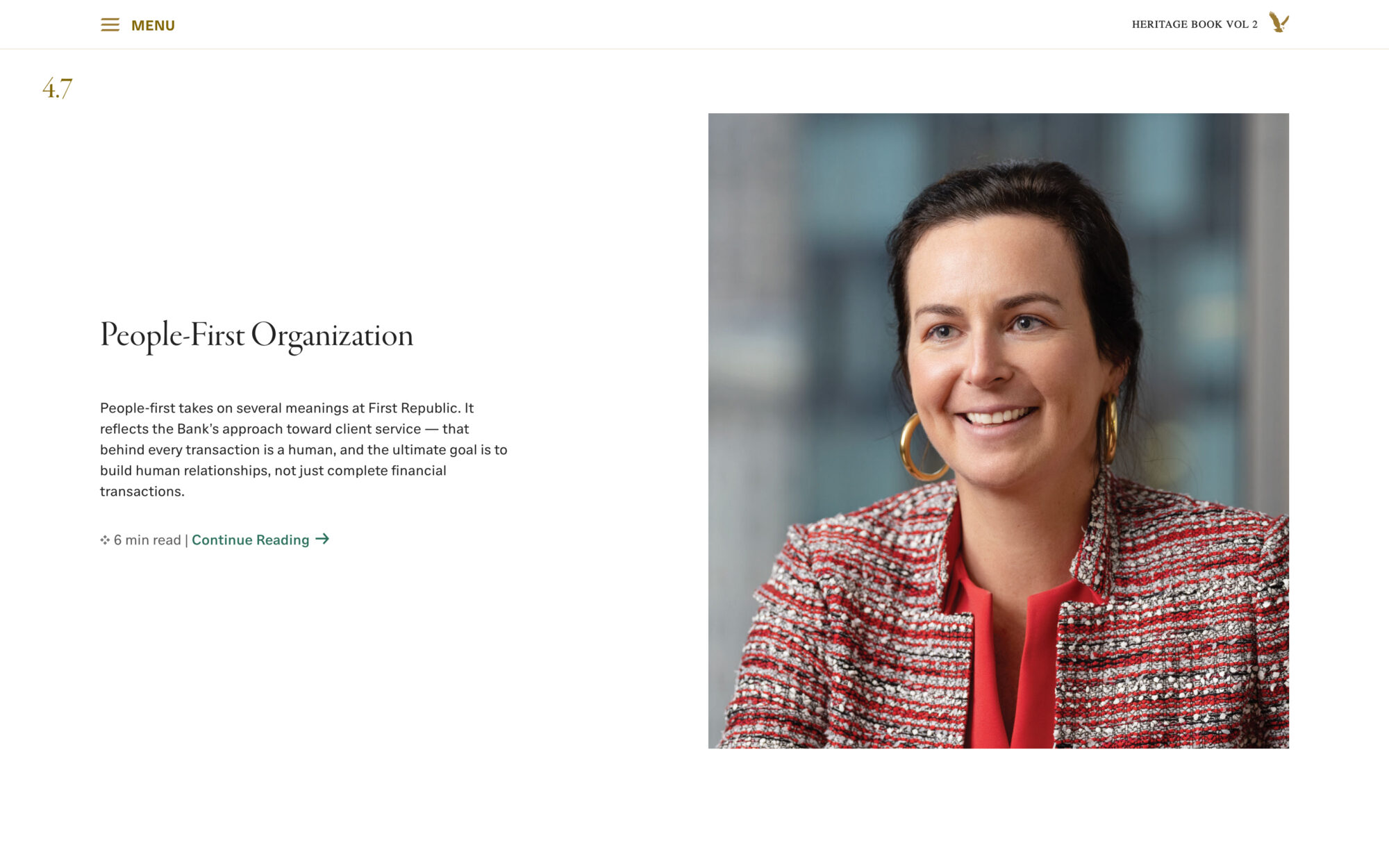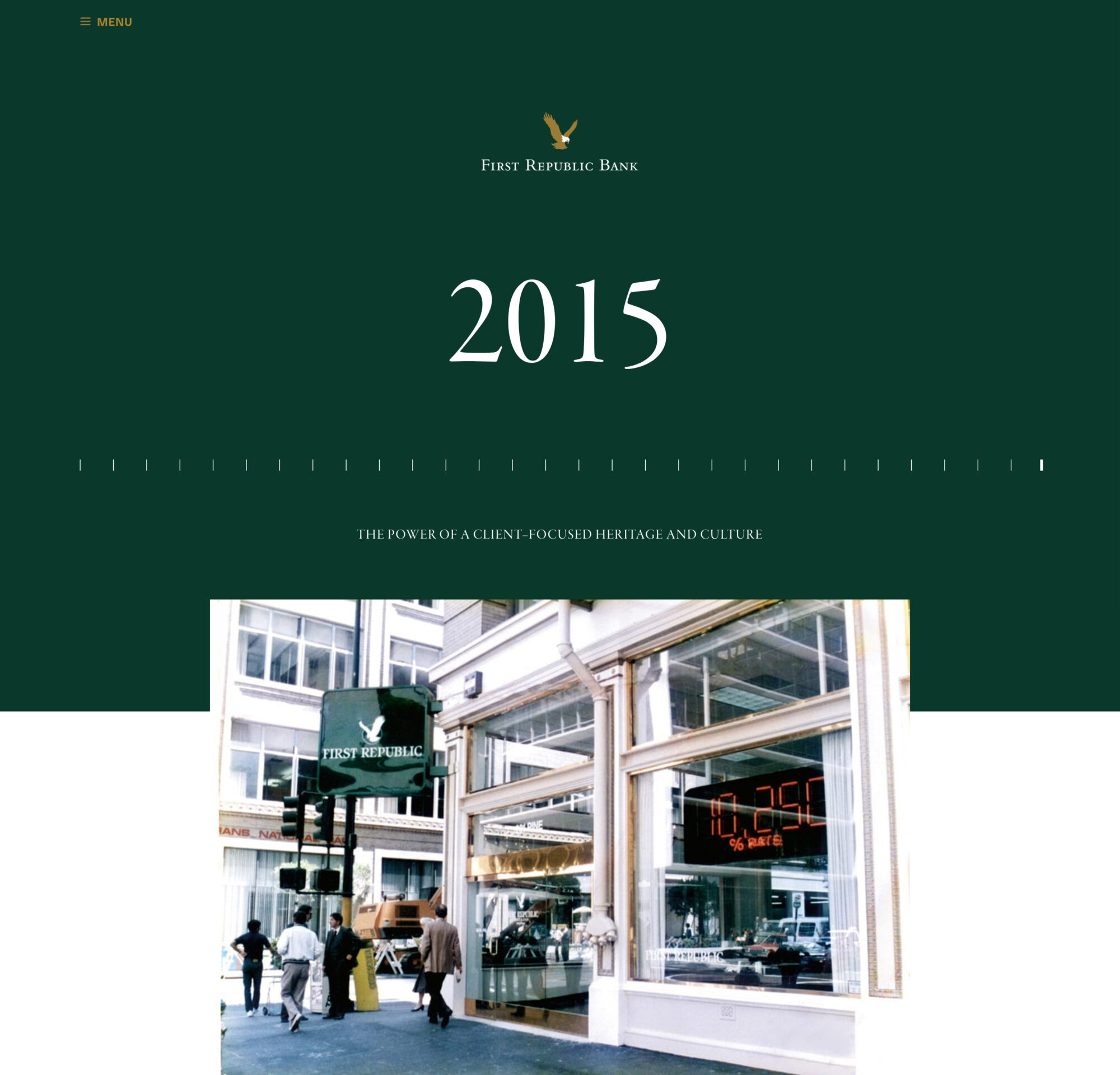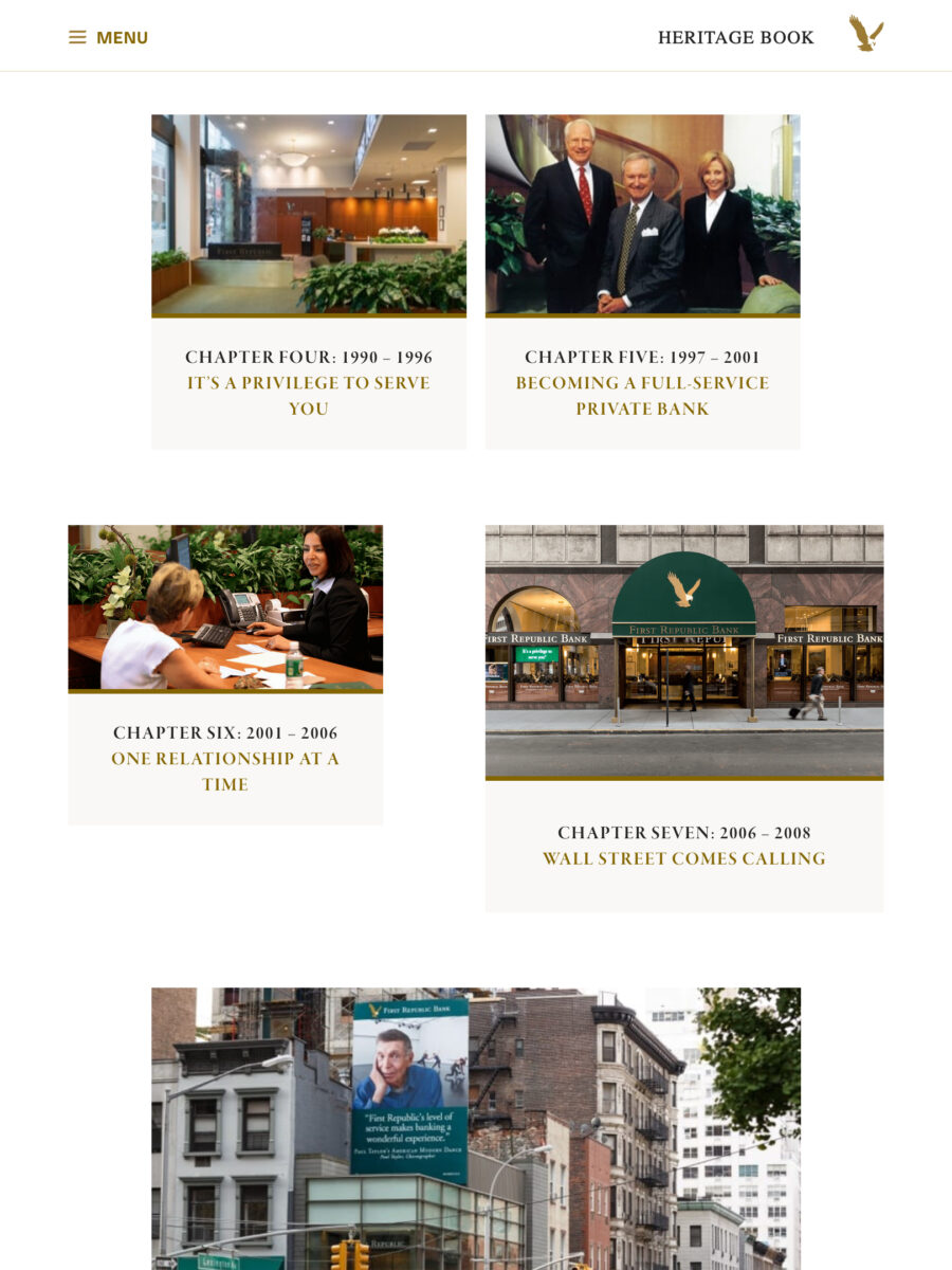 The First Republic Bank Heritage Book provides a true reflection of the Bank’s team-based approach. The website utilises historical content to provide an insight into the evolution, personality and heritage of the bank.
